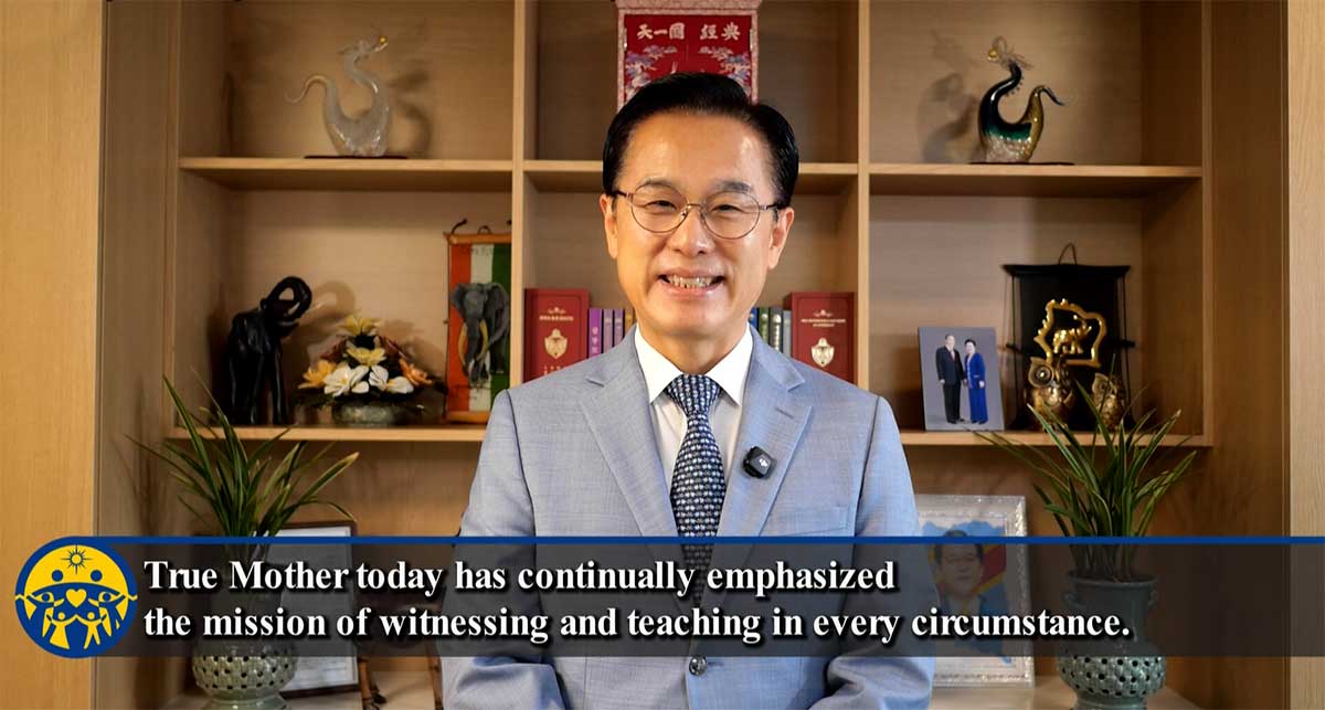 اعضای محبوب، امیدوارم در طول این هفته عشق والدین راستین و شیم جانگ عمیق آنها را در درون وجودتان حمل کنید و روزهایتان در حالی که با خدا همقدم هستید، سرشار از هدف و نشاط باشد. دعا میکنم که فیض و صلح والدین بهشتی همواره با شما باشد. سپاسگزارم.